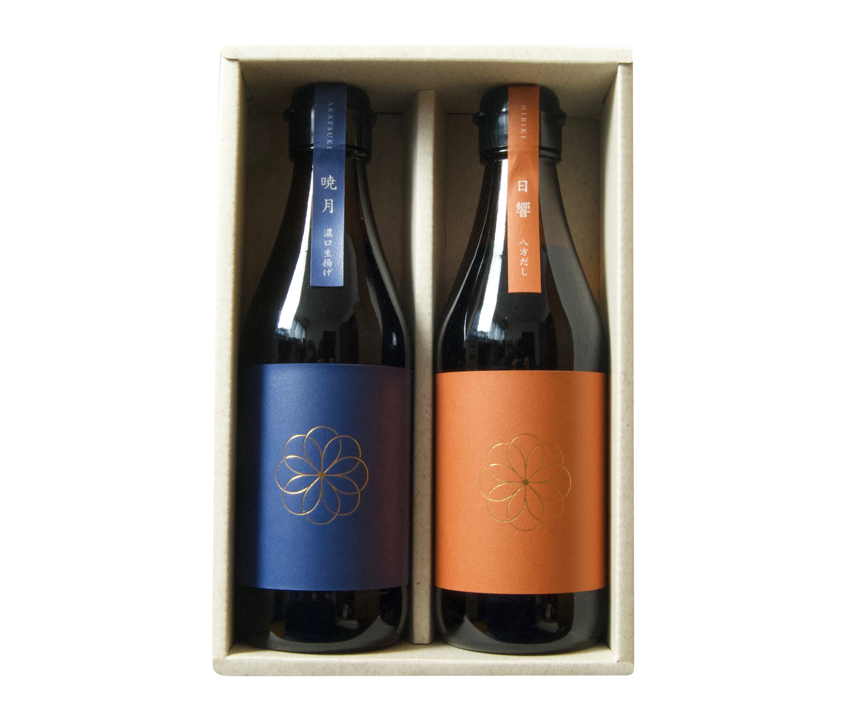 ギフト包装の暁月(濃口生揚げ醤油)+日響(八方だし)300mlのセットです。