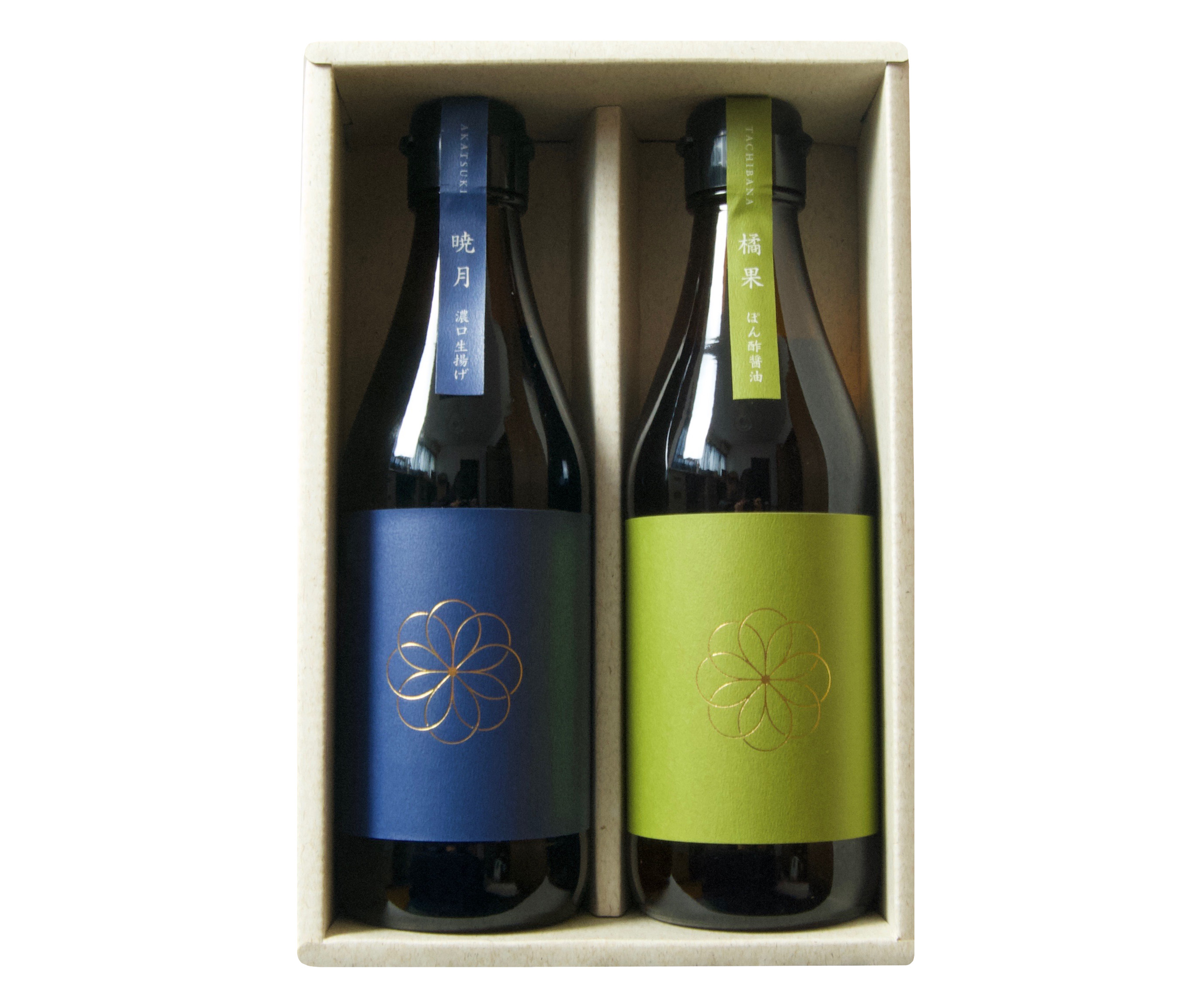 ギフト包装の暁月(濃口生揚げ醤油)+橘果(ぽん酢醤油)300mlのセットです。